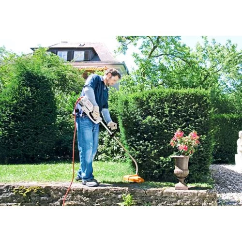 De série, les coupe-herbe électriques STIHL sont munis d’un système d’attache absorbant les efforts de traction exercés sur le câble. Cela écarte le risque de débranchement inopiné du câble électrique de l’appareil.