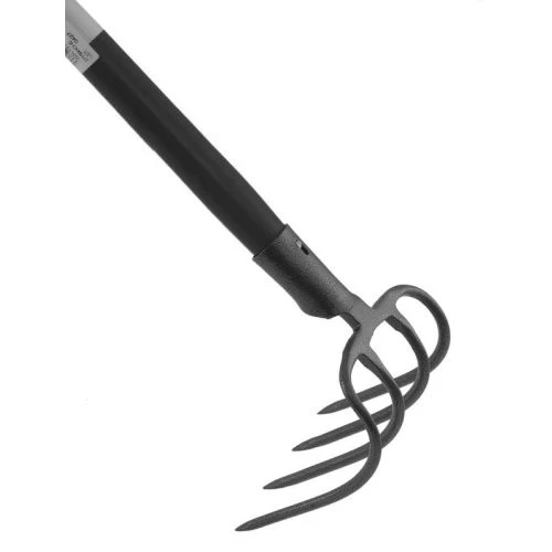 Un croc à fumier qui sert à extraire les pierres du sol et à émietter la terre. Il dispose de 4 dents avec des pointes protégées. Quant à la fixation, la manche vient se fixer par douille.