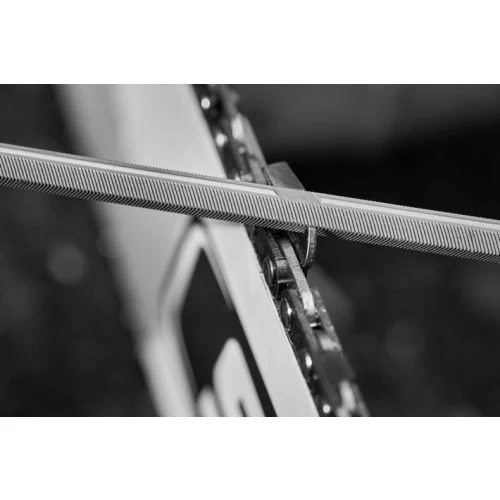 - Plus besoin d’effectuer des rotations avec le poignet comme avec une lime ronde traditionnelle : l’affûtage se fait uniquement en poussée. Le témoin sur la partie supérieure de la lime permet de bien la positionner sur la chaîne.