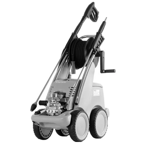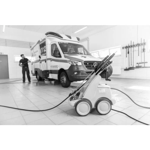 Le nettoyeur haute pression Quadro 599 TST 3300 W de Kränzle est doté d’un tambour-enrouleur intégré avec manivelle rabattable, d’un châssis avec roues tout-terrain de grand diamètre et d’un réservoir d’eau pour éviter l’endommagement de la pompe à haute pression en cas de manque d’eau.