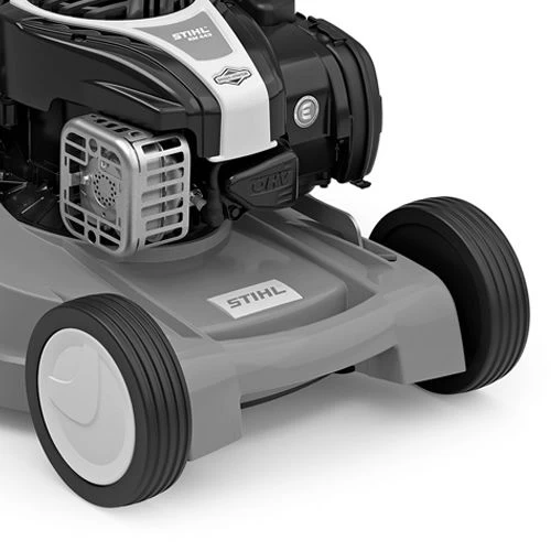 - Cette tondeuse à gazon Stihl est équipée de poignées pour faciliter le transport et faciliter le chargement. Les poignées de transport sont également appropriées comme points d’arrimage pour attacher la tondeuse à gazon avec une sangle pendant le transport.