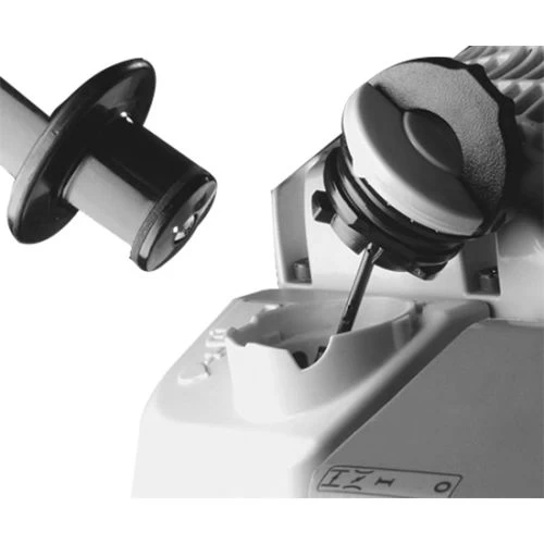 Permet une régulation précise du débit d’huile en fonction des besoins. Le réglage sur la marque E garantit en tout cas un débit d’huile suffisant et il est possible de réaliser jusqu’à 50 % de réduction du débit d’huile. Pour les garnitures de coupe plus longue et le bois sec un plus grand volume d’huile doit être réglé